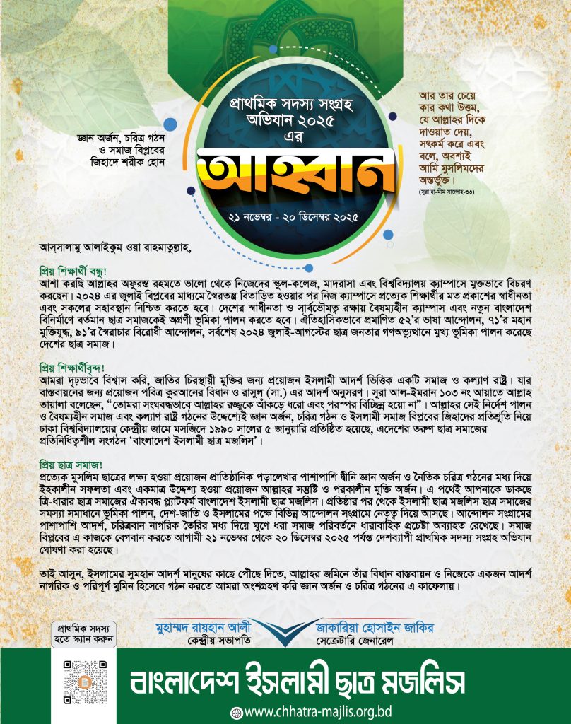প্রাথমিক সদস্য সংগ্রহ অভিযান ২০২৫ এর প্রথম দিনে, কেন্দ্রীয় কর্মসূচি বাস্তবায়নের লক্ষ্যে শিক্ষার্থীদের মাঝে লিফলেট বিতরণ করে ঢাকা মহানগরী উত্তর শাখা।